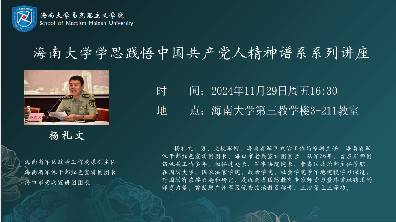 2024年11月29日,bv伟德国际1946邀请海南省军休干部红色宣传讲团团长杨礼文大校作伟德国际1946手机学思践悟中国共产党人精神谱系系列讲座报告。报告以“认识南海,热爱南海,捍卫南海”为主题,从南海的基本情况和复杂成因两个方面展开讲述。报告由凤翔书院郭孝伟老师主持,bv伟德国际1946蔡文举副院长参加。