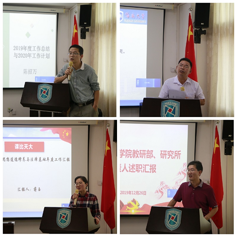 大会上各系部和研究所负责人共8名教师按照分组安排进行全面的述职汇报,分别阐述了2019年度开展的系部和研究所的建设情况,取得的科研成果,参加的社会服务,分析了在2019年度工作中存在的不足,并提出对于下一年度开展工作的展望,在场的评委给每位述职教师进行评分。