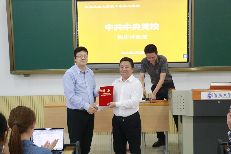 1月2日,bv伟德国际19462019-2020学年冬季小学期名家讲堂第二讲在五号教学楼112教室举行。中共中央党校韩庆祥教授应邀作《唯物史观与历史生成论》学术报告,院长张云阁出席并为并为韩庆祥教授颁发了伟德国际1946手机“冬季小学期授课外聘专家”证书。讲座由思想政治教育系主任陈招万主持。