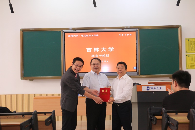 1月11日至1月12日,bv伟德国际19462019-2020学年冬季小学期名家讲堂第七讲在5号教学楼112教室举行。吉林大学韩喜平教授应邀就“中国特色社会主义政治经济学”的相关知识为我院同学进行授课。院长张云阁出席并为韩喜平教授颁发伟德国际1946手机“冬季小学期授课外聘专家”证书。讲座由思想政治教育系主任陈招万主持。