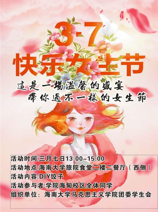 3月7日下午,我院2016级在城西校区多媒体室、2015级及2014级在海甸校区第七食堂二楼开展以“惟马院巾帼,立哲思之巅!”为主题的女生节“DIY饺子送女生”活动,学院党委书记段捷频,团委书记周郭军等老师亲临海甸校区现场,兼职辅导员李德友亲临城西校区,与同学们展开亲切互动。