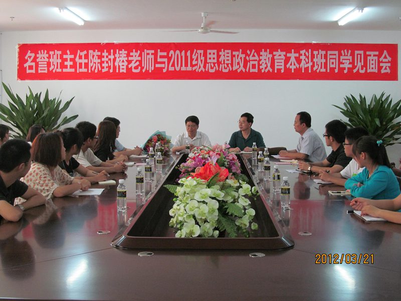 2012年3月21日下午,我院于学院三楼会议室举行名誉班主任聘任仪式暨名誉班主任与2011级思想政治教育专业本科班全体同学见面会。校党委副书记、纪委书记陈封椿老师,院长李德芳老师,书记梁谋老师,系主任王善老师,学工办主任周郭军老师,班主任陈思莲老师及2011级本科思政班全体同学参加了见面会,大会由院党委书记梁谋老师主持。