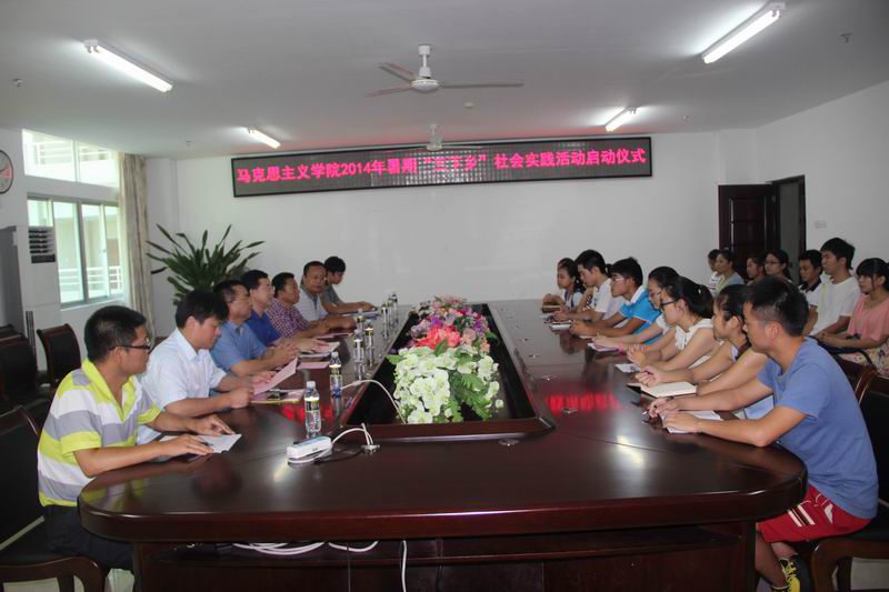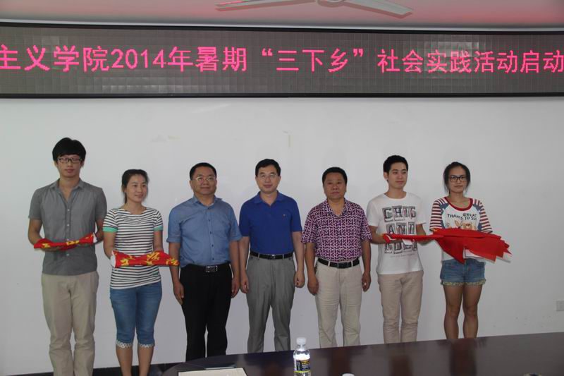 7月9日上午,我院在学院会议室举行2014年大学生暑期 “三下乡”社会实践活动启动仪式。院长李德芳、院党委书记段捷频、副院长张云阁,社会实践团队带队老师李辽宁、王善、张君成出席,全体参加社会实践团队的同学参加启动仪式。仪式由王善老师主持。 李德芳院长在仪式上作动员讲话。他说,学院高度重视大学生暑期社会实践活动,学院老师结合自己的在研课题,积极组织 暑期社会实践团体,为活动的深入开展提供了强有力的支持。在同学们的积极参与和相关老师的精心指导下,我院大学生暑期社会实践每年都取得了比较好的成果,并形成了一些好的做法和传统。他对参加社会实践团队的同学们提出了四点要求,一是要树立集体观念、培养合作意识、发扬团结协作精神;二是要深入基层、深入农村,为群众服务、向群众学习;三是要结合专业特点提升志愿服务水平,形成高水平的社会实践成果;四是要高度重视安全问题。最后,他希望同学们珍惜机会,真正在实践的过程得到锻炼和成长,并力争拿出一些高水平的实践调研成果。 社会实践团体指导教师代表李辽宁老师、暑期社会实践学生代表李飒楠同学分别在仪式上发言,参加社会实践团队的全体同学进行了宣誓。 在启动仪式上,院长李德芳、院党委书记段捷频、副院长张云阁分别向四支社会实践团队授院旗。今年暑期的四只社会实践团队分别是:红色文化资源调研与老区支教社会实践团、“ 海南省公民阅读现状”实践调查团、“海南黎苗旅游村寨保护与开发”实践调查团、“海南红色文化实践育人功能”实践调查团。