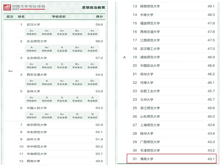 6月18日,高等教育专业评价机构软科今日正式发布2022“软科中国大学专业排名”,在 2022年中国软科中国最好专业排名中,bv伟德国际1946思想政治教育本科专业以31名进入全国思政本科专业类A类。