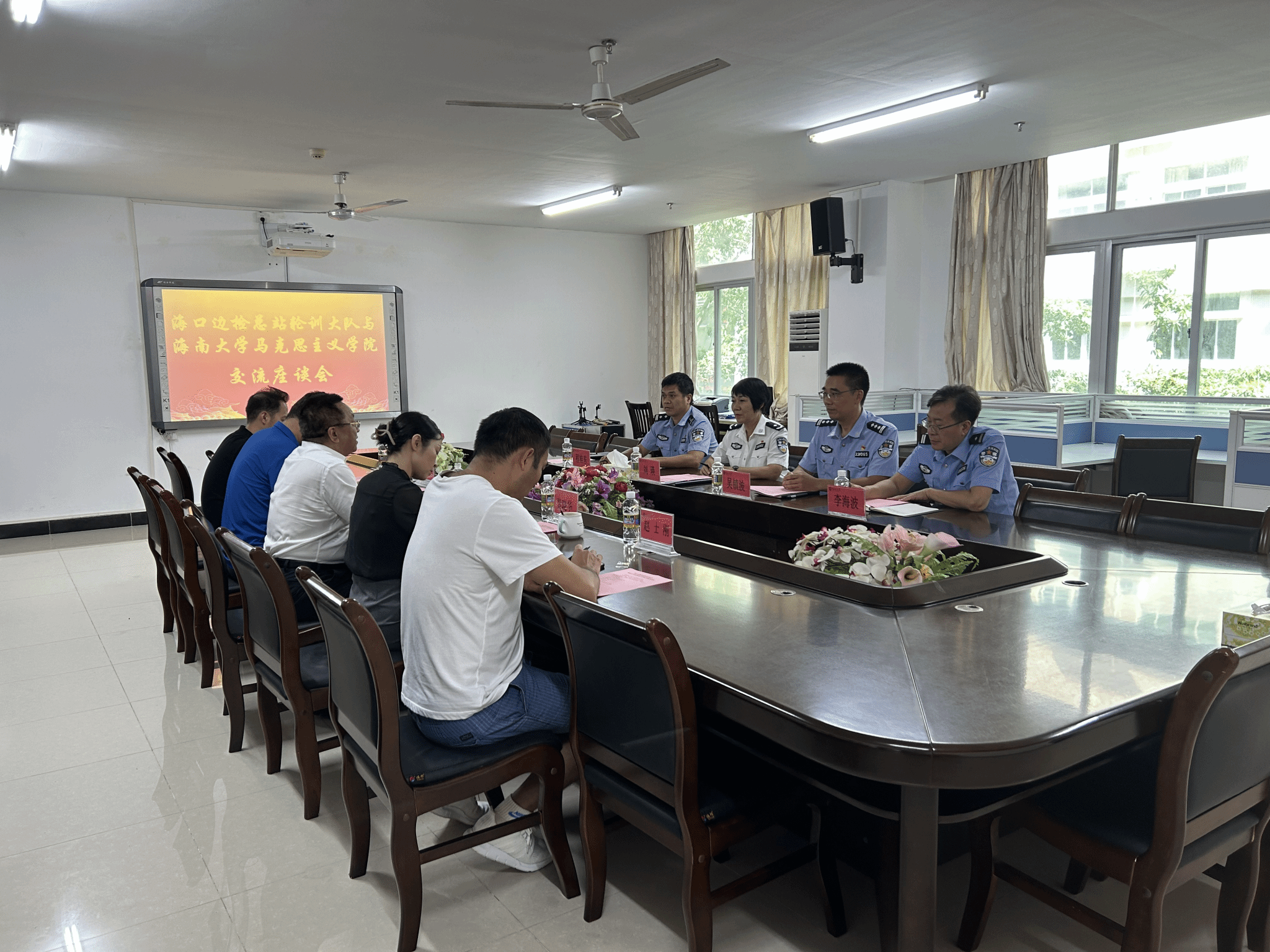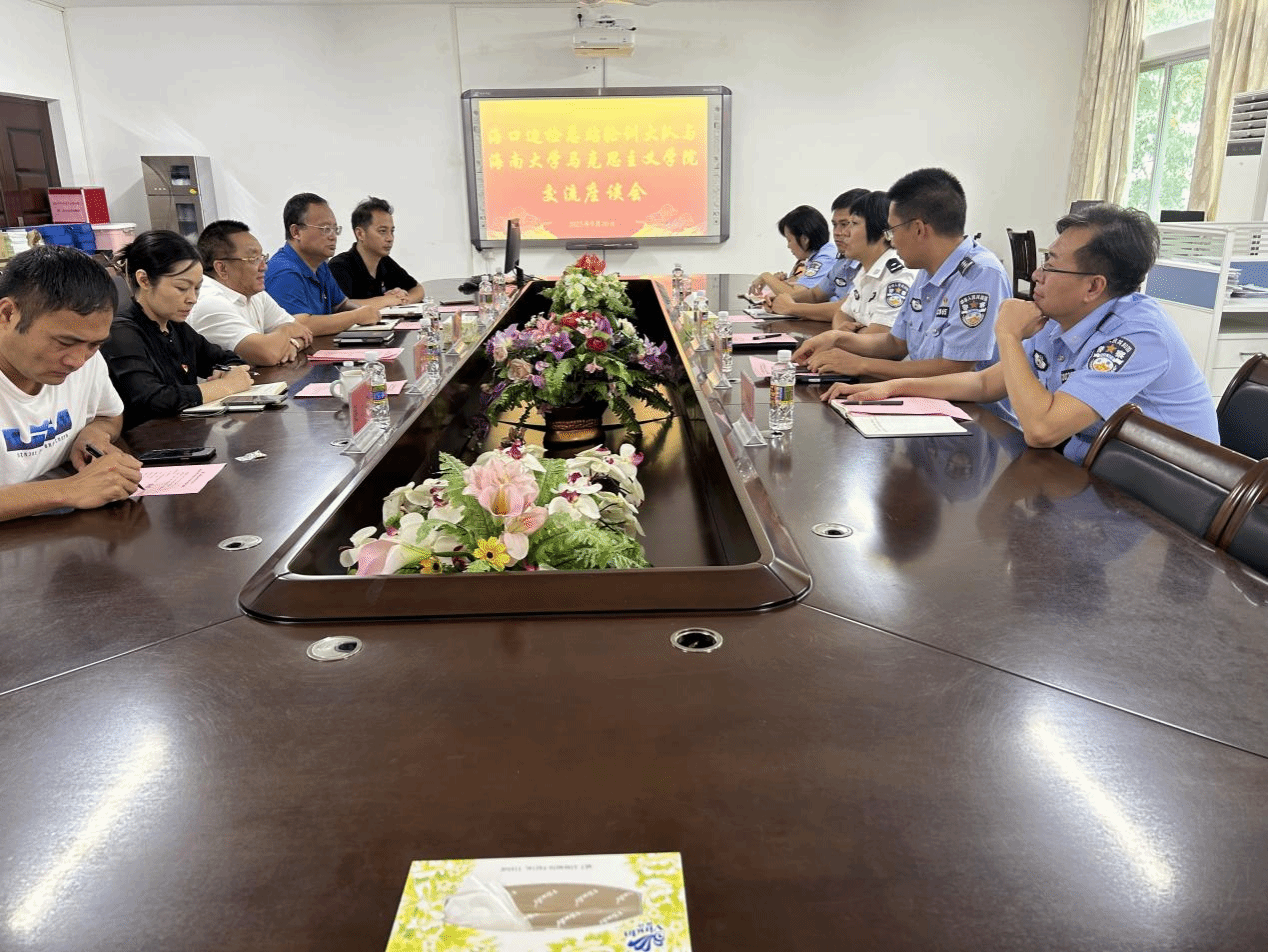 2023年9月20日海口边检总站轮训大队与bv伟德国际1946在社科楼A311会议举行交流座谈会,海口边检总站轮训大队大队长刘瑛、副大队长吴镇波、处长程桂东、教员李海波和陈蕾出席座谈会,bv伟德国际1946部分领导班子成员和科室主任参加会议,会议由学院党委书记段捷频主持。
