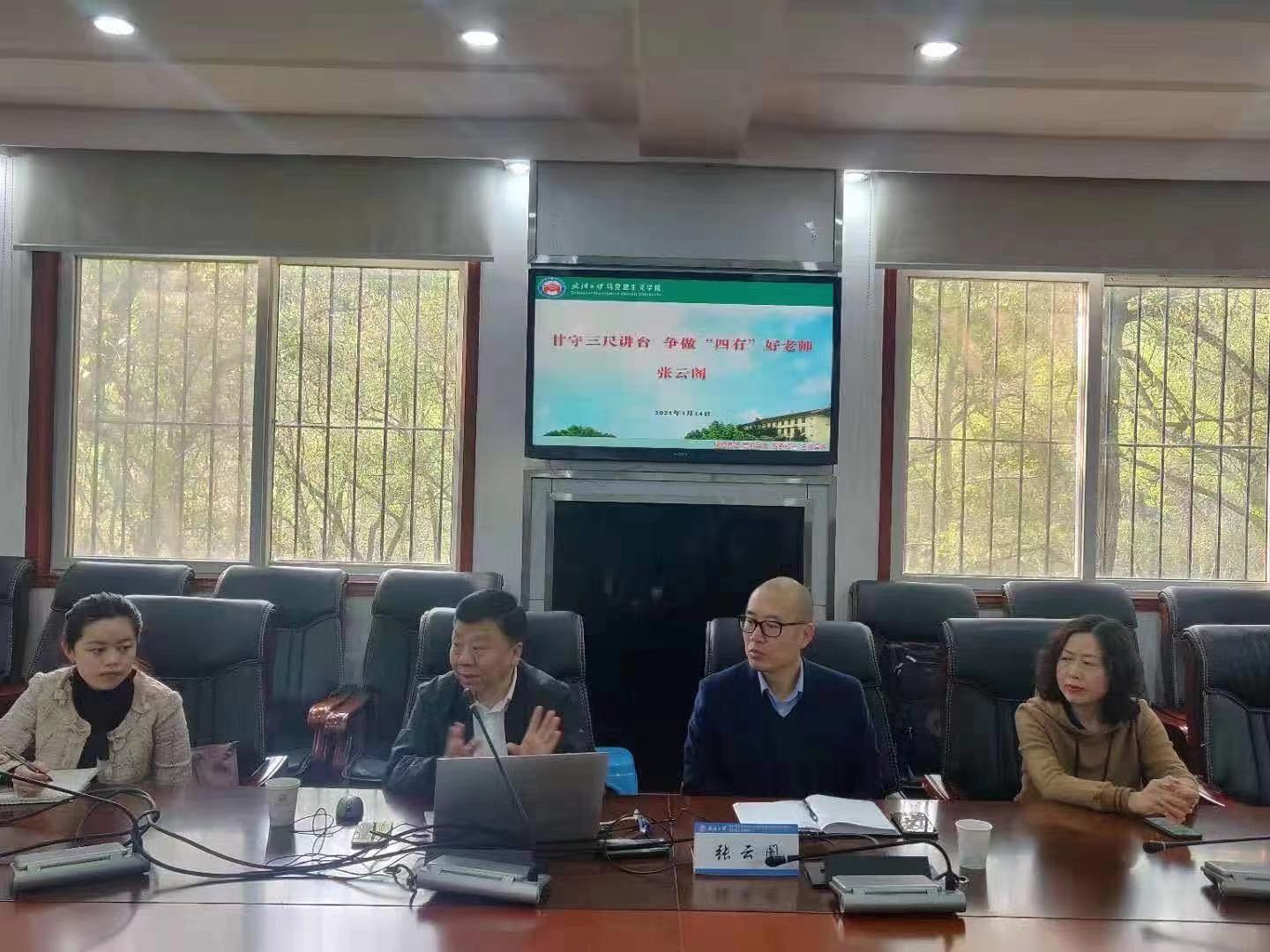 14日上午,应武汉大学bv伟德国际1946的邀请,张云阁教授又为学院师生做了一场:甘守三尺讲台 争做“四有好老师”的师德师风报告。张云阁教授从教书育人是教育的本质要求、好老师是大学的灵魂、好老师必备的条件和实现“四有”好老师的路径四个方面,结合自身的工作经历,报告了自己的理解与体会。张教授的报告内容丰富、案例生动、语言幽默,教育性强,得到了与会师生的高度评价。报告结束后,张教授还回答了师生们提出的问题。