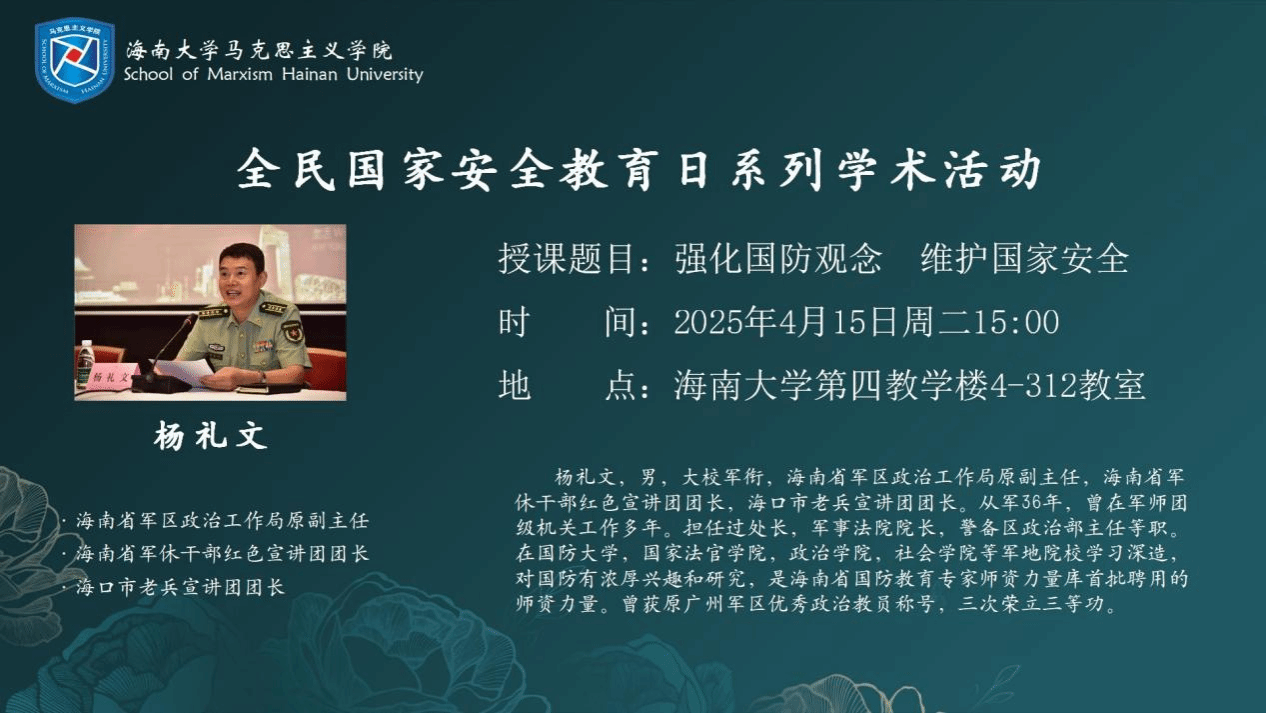 2025年是《中华人民共和国国家安全法》颁布施行10周年,为深入学习贯彻总体国家安全观,提升国家安全意识和素养。2025年4月15日下午,bv伟德国际1946邀请海南省军休干部红色宣传讲团团长杨礼文走进形势与政策课堂,以“强化国防观念,维护国防安全”为主题,从树立国防观念的历史背景和当前国际局势两个方面展开授课。